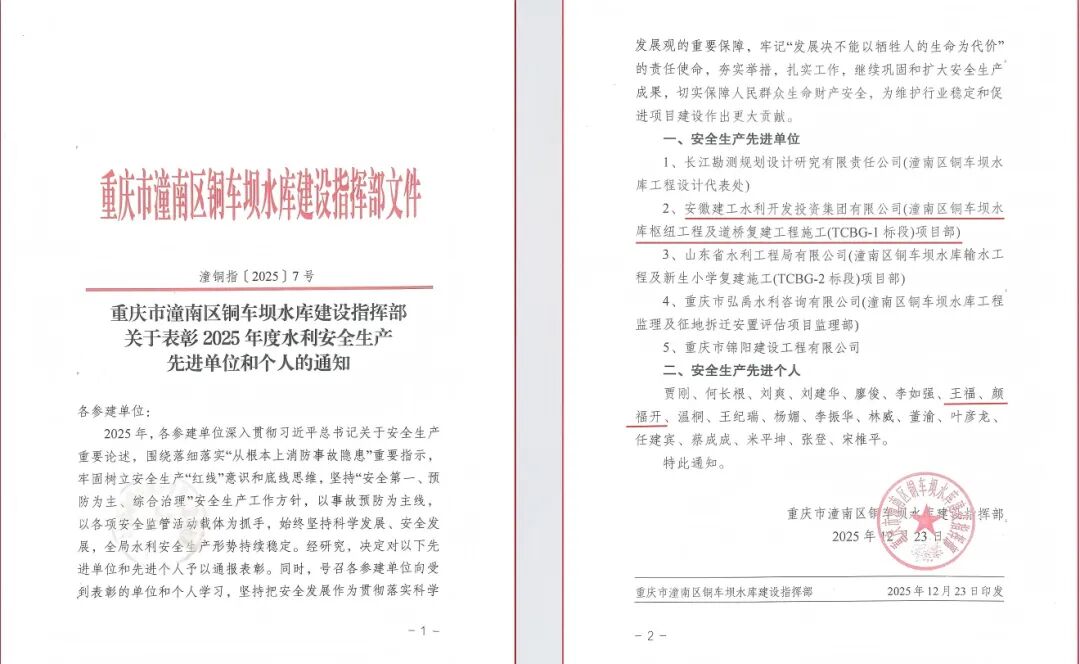 日前,潼南区铜车坝水库枢纽工程及道桥复建工程获评重庆市潼南区铜车坝水库建设指挥部“2025年度水利安全生产先进单位”,项目职工王福、颜福开荣获“安全生产先进个人”称号。